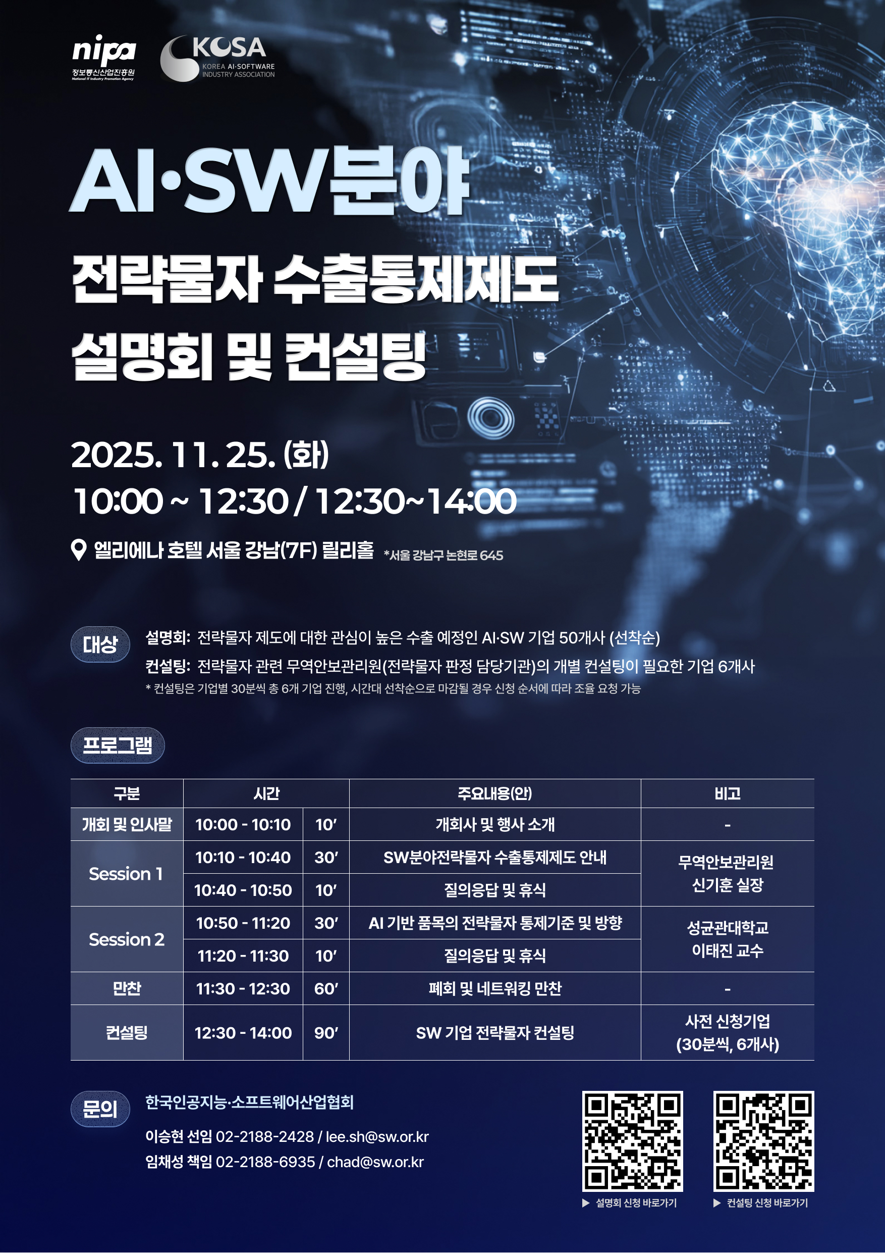 정보통신산업진흥원과 한국인공지능·소프트웨어산업협회는 AI·SW분야 수출기업의 전략물자 수출통제제도 인지도 제고 및 인식 확산을 위해 설명회 및 컨설팅을 운영하오니 많은 참여와 관심 부탁드립니다.